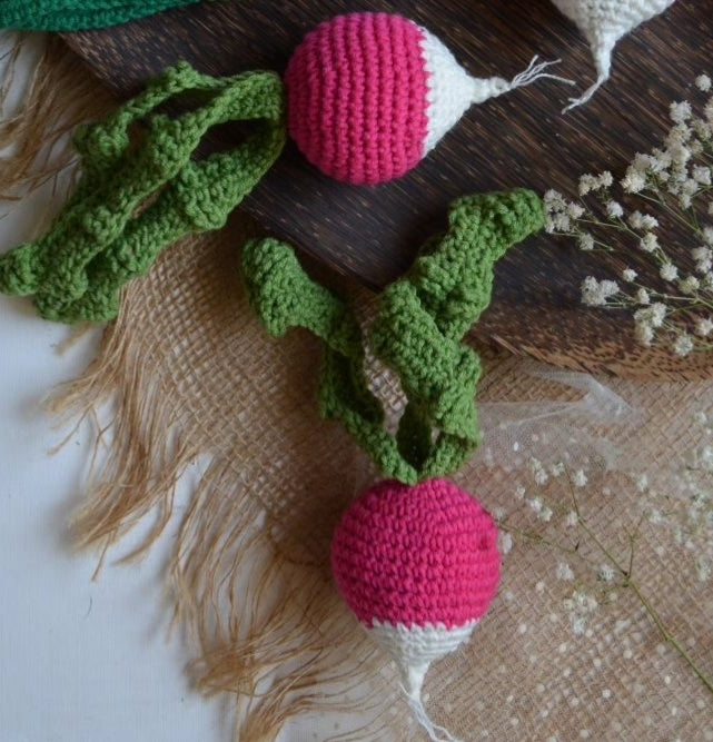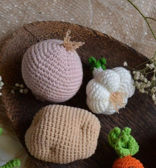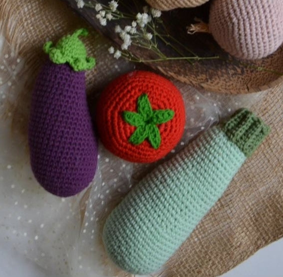 These crochet vegetables are handmade, soft yarn creations designed to look like real produce while being safe and durable for play or display. Each piece is carefully crocheted with attention to colour, texture, and detail, making them ideal for children’s pretend kitchens, educational activities, or charming home décor. These crochet vegetables combine creativity and craftsmanship, offering a reusable, eco-friendly alternative to plastic toys and decorations.